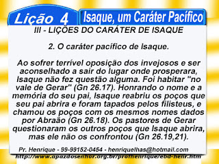 CONSULTE - Revista Ensinador Cristão - CPAD, nº 70, p38. Resumo Rápido do Pr. Henrique - Lição 4, Isaque, um Caráter Pacífico Data provável - 1818 a.C. O caráter é a vida de uma pessoa demonstrada interirormente para DEUS e exteriorrmente para as pessoas, podendo diferir nas duas apresentações. O homem pode ter um relacionamento com DEUS bem diferente do que tem com os homens. Isaque tinha uma fé que agradava a DEUS, mas um comportamento com a sociedade em que vivia que não condizia com sua vida com DEUS. Mentiu e enganou a Abimeleque e ao povo de Gerar (os filisteus), dizendo ser Rebeca sua irmã, embora fosse sua esposa. Isaque seguia nas pisadas de seu pai porque seu caráter havia sido moldado por ele. Teve altos e baixos, mas mais altos do que baixos. O nome Isaque que significa 'ele ri", ou "aquele que ri", foi dado por DEUS, quando três anjos visitaram Abraão e Sarai. Um deles era uma teofania, ou seja, o próprio JESUS (pré-encarnado), assim o acreditamos, pois este aceitou adoração e intercessão por Ló, enquanto os outros dois foram para Sodoma, executar o plano de DEUS. Gênesis: 25. 20. e Isaque tinha quarenta anos quando tomou por mulher a Rebeca, filha de Betuel, arameu de Padã-Arã, e irmã de Labão, arameu. Gênesis: 25. 26 E depois saiu o seu irmão, agarrada sua mão ao calcanhar de Esaú; por isso se chamou o seu nome Jacó. E era Isaque da idade de sessenta anos quando os gerou. ISAQUE CASOU COM 40 E TEVE SEUS DOIS FILHOS COM 60 ANOS. Abrão ainda teve 15 anos para brincar com seus netinhos e com seus 6 filhos que lhe nasceram de Quetura, fora os filhos de Ismael. Abraão tinha 100 anos quando Isaque nasceu. Isaque tinha sessenta anos quando nasceram seus filhos. Abraão tinha então 160 anos. Abraão morreu com 175 anos. Gênesis 25.7 Estes, pois, são os dias dos anos da vida de Abraão, que viveu cento e setenta e cinco anos. Isaque tinha seu caráter moldado pelo pai. O pai foi a Gerar e depois ao Egito (Gerar era caminho para se chegar ao Egito, chamava caminho dos filisteus). Isaque saiu de Berseba com destino ao Egito. DEUS o impediu. Ele fica onde seu pai também havia ficado quando voltou do Egito. Isaque, com o caráter influenciado pelo pai, repete a mentira do pai e passa pelas mesmas situações. DEUS providenciou um plano para Abrão voltar a Canaã e Abimeleque deu uma mãozinha nisso (expulsou-o por inveja e medo de que ficasse poderoso demais) . Abrão foi descendo de volta a Canaã e abrindo poços e dando nome a esses poços de acordo com a situação que vivia. Os filisteus foram contendendo e entupindo esses poços.